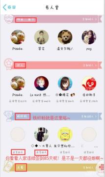 名人堂其实就像是大神榜啦~各种风云人物的聚集地~什么酋长团啦~明星人物啦~达人啦~土豪啦~当然还有今天的重点:铁杆粉!至于怎么才能成为铁杆粉~当然就是连续签到7天就可以啦~中途不能断的哦~你看看人家最长的签到85天!小伙伴们可要知道,我们的签到天数可是实打实的每天一签,不能早也不能晚,漏了花钱都不能补的,只能从1开始呢!