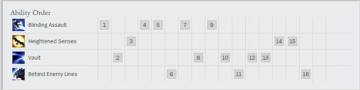 被动:攻击一名易损目标,将会使奎因的攻击速度和移动速度提升20/25/30/35/40%,持续2秒。