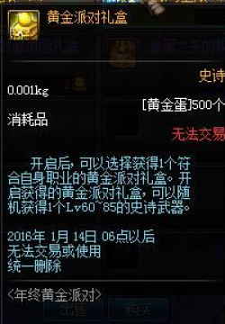 DNF年终黄金派对活动就为大家简单的介绍到这里,其中年终派对礼盒、黄金派对礼盒分别需要300个和500个黄金蛋才能兑换,而60-85等级SS跨度也是让脸黑党充满了绝望,毕竟我相信大部分人开的都是60SS武器有没有。