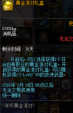 作者:qqtn小影 人气:0DNF黄金派对礼盒开出85史诗武器几率测试分享,在不久前DNF体验服才更新了年终派对福利活动,国服也将于17日更新上线,玩家在刷深渊的同时可以击杀披着羊皮的狼来获得黄金蛋,而黄金蛋则可在赛丽亚的房间内金蛋之王处换取年终礼盒。打开可以获得60-85的史诗武器.
