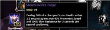 把移动速度加成增加到了40%,触发时间延长到2.5秒,并且在效果持续的时候英雄拥有100%的减速抗性,也就是说,触发了风暴骑手之后你的英雄就跟开了大招的剑圣是一样的!虽然只有3秒,但这3秒已经足够你做很多事情了!