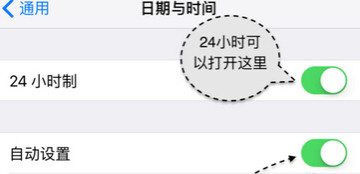 4、在默认情况下 iPhone 上显示的时间是12小时制的,如果想要设置为24小时制的话,可以点击打开【24小时制】的选项。另外如果想要手动为 iPhone 校正时间的话,请先点击关闭【自动】选项。