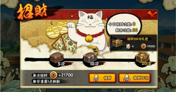 这个方法是小编最不推荐的方法了,点击铜币后面的“+”号,可以直接进入招财界面,我们可以看到招财事需要我们用金币来兑换铜币的,单次招财,可用20个金币兑换21700个铜币,金币这种东西在游戏中也算是稀缺货,所以小伙伴们还是不要浪费在这里了,想要赚取铜币的小伙伴可以试试下面的方法!