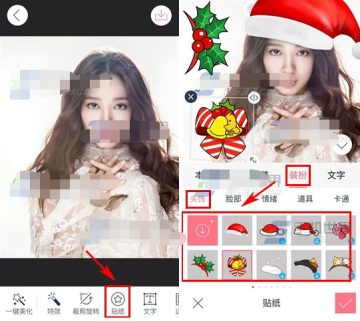 2)接着点击【贴纸】,在【装扮】栏,有各类圣诞节的帖子哦!赶紧来试试吧!(如下图)