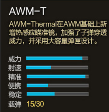 AWM-Thermal在AWM基础上新增热感瞄准镜,加强了子弹穿透威力,并采用大容量弹夹射击。很多玩家一开始是不习惯的,因为一开镜里面是黑白的。