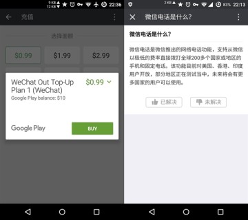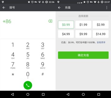 费用方面,点击充值按钮会弹出Google Play充值界面,打往中国的主叫电话资费为每0.99美元110分钟,折合人民币约为6分钱每分钟,非常划算。