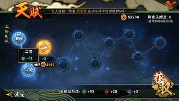 从图中我们可以看到一个蛇形的天赋树,这个天赋树是二阶天赋。也就是说笔者已经将一阶天赋全部点满了,从这里开始强化的是新一轮的天赋。天赋系统是通过增加额外的属性而强化玩家操控的忍者的方法,最为重要的是,使用天赋系统强化的不仅仅是某一个忍者,而是全部忍者都可以从中获益。