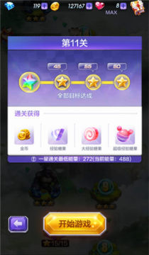 本关的通关要求是获取一定数量彩色星星,3星通关条件是获取60颗彩星。达到1星通关的最低能量是272点,特工papa在对11关进行评估的时候进行了一下计算,得出3星最低的通关能量是300点左右。所以大家在达到300能量的时候就可以进行闯关了,但是不仅仅是这样,还得和特工papa一起来看看本关还有哪些过关技巧。