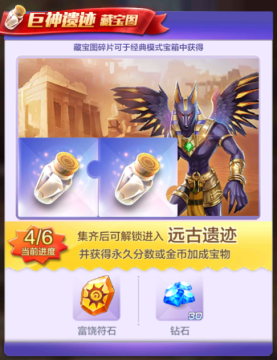 集齐后可解锁进入远古遗迹,并获得永久分数或金币加成宝物。