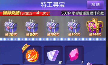 特工寻宝额外奖励就是根据玩家累计抽奖次数就可以领取额外奖励,额外奖励的累计次数每周都会进行重置。目前额外奖励分为累计抽奖10次、50次、100次、200次、388次几个档位。