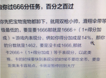 先把宠物宝物都卸下,就用双枪小帅,滑翔伞带等级最低的,要是要1666那就是1666/(1+得分加成)=游戏内表现分,假如你得分加成是14%,那你的分数就是1462,要是没卡成1666,那就卡2666/(1+得分加成)=表现分,以此类推,卡的时候要快到表现分的时候不要吃金币,要靠距离来卡容易点,卡就是暂停回到大厅。