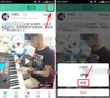 1)打开Tutu,进入首页点击右上角的【照相机】按钮,选择【相册】。(如下图)