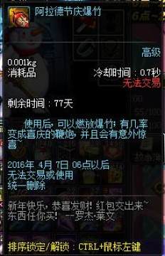 作者:qqtn小影 人气:0DNF玩家购买2016春节礼包会赠送200个阿拉德节庆爆竹,使用后可以燃放爆竹,有几率变成喜庆的鞭炮,那么个宝珠可以开出什么东西呢,想必大家一定很关心,这里小编来给大家讲解一下。