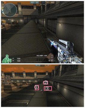 点位分析:由于这个点是整张地图上少有的防守位,很多玩家都喜欢抢这个点。小编建议大家站在图二处位置。因为你站得越靠后,越能看清楚前方动向,即使前方出现生化母体,你也有足够的时间应付。在防守时,应按照图二数字的优先顺序来击退生化,一号位置是生化攻进长廊平台的必经点,二号与三号位则是到达长廊的生化上平台的必经点,如果配合良好,这个点将会是一个刷分位。