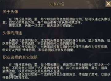 在青丘狐传说里,每个职业的角色性别是固定的,您可以通过头像设置,自定义的角色外观,每个职业都有3枚头像可供选择。