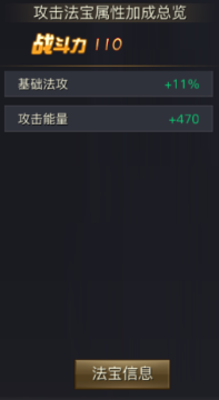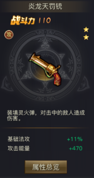青丘狐传说手游法宝是一个提升人物属性的部分,拥有独立属性,同时还自带法宝技能。炎龙天罚铳是一个攻击型法宝,强力攻击,对击中的敌人造成伤害。初始战斗力为110。