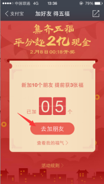 打开支付宝最新版本客户端,在支付宝首页即可看到新春送福的活动,点击进入后,大家需要新加10个朋友,才能够提前获得3张福哦!