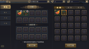 物品分解:点击“分解”按钮,会开启道具分解界面,在这里玩家可以将不需要的道具进行分解,分解可获得对应类型的材料。分解功能是游戏中十分常用的一个功能,具体的内容还请玩家进入游戏中自由体验!