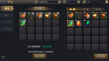 物品出售:点击“出售”按钮,可开启道具出售界面,在该界面玩家可以将自己不需要的道具出售,获得银币。也可以通过“一键勾选背包内蓝色以下品质物品”功能进行快速出售,省去很多选择的步骤。通过出售功能,玩家可以提高自己获得银币的效率,在游戏进行到某些阶段比较缺钱时,不妨试着卖掉一些不太可能用到的道具来换一些银两吧!
