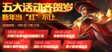 活动期间,玩家每天参与各个模式5V5战斗,均有概率获得红包,每天上限8个;而在春节期间(2月6日至9日)会掉落大红包,打开奖励翻倍50%(猴字打开数量不变)。