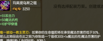 唯一被动—救主灵刃:如果你的生命值,即将在承受魔法伤害后低于30%,那么此物品会在此之前为你制造一个吸收300(+1x魔法抗性)魔法伤害的护盾,持续5秒(冷却时间:90秒)。