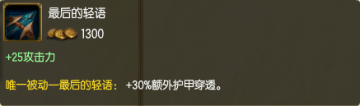 评价:最后的轻语是以极低的经济,换回30%的护甲穿透以及25AD,穿透装备的合成小件。
