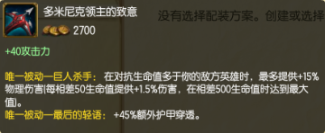 评价:由于巨人杀手会在生命值相差巨大的情况下,对敌方战士造成巨大伤害这时候,有些玩家就会选择放弃一些高生命值加成的装备,多出护甲。面对这种情况,ADC玩家就可以考虑将巨人杀手升级到最终形态,多米尼克领主的致意,能提供40%的额外护甲穿透。并且造成的额外伤害上升到15%,在游戏中后期合出能发挥出巨大的威力。