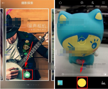 1)打开【相机360】进入应用,点击【摄影探索】,左右滑动找到【留声相机】点击下方【相机】小图标。(如下图)