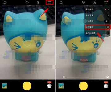 打开相机360进入应用,进入相机拍照画面后点击右上角【三】,接着打开【触屏拍照】,即可触屏拍照。(如下图)
