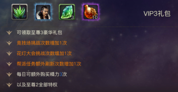 作者:qqtn可乐 人气:0青丘狐传说手游VIP3包含了之前VIP1、VIP2所有特权,玩家充值到VIP3之后,可以领取至尊3特权礼包,增加了竞技场挑战次数、花灯大会挑战次数,同时可以额外购买3次精力。