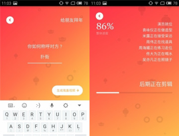 二、开启App后,不用输入台词,直接点击右下角的“鬼畜拜年”按钮就可以了。接着,输入拜年对象的身份,输入拜年对象的名字或者昵称,就可以生成鬼畜拜年视频了!在生成的过程中,鬼畜输入法App会列出鬼畜视频的素材来源,很有参与感!