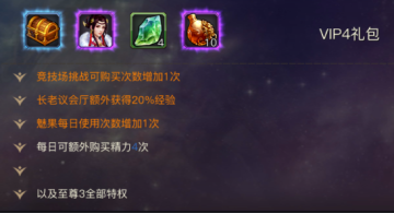 作者:qqtn可乐 人气:0青丘狐传说手游中VIP4特权相比之前的等级VIP特权要好太多,各项特权福利加倍送。包括点将台免费刷新次数+1、竞技场可购买次数+1、长老议会厅额外获得20%经验等等,同时还包括V1-V3所有系列特权。