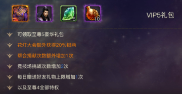 作者:qqtn可乐 人气:0青丘狐传说手游VIP5特权包括至尊5豪华礼包、至尊4全部特权。玩家充值达到VIP5等级之后,增加了竞技场挑战次数2次、赠送好友礼物上限1次、帮会捐献次数额外增加1次等特权。