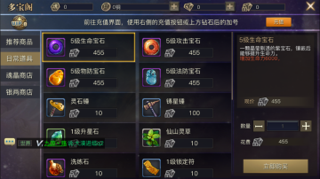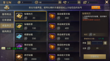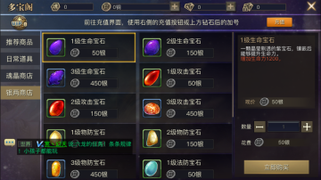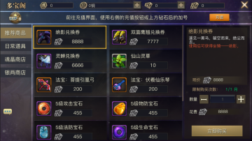 多宝阁分为推荐商店、日常道具、魂晶商店、银两商店四大块