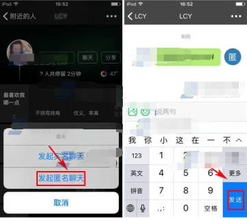 2)接着点击【发起匿名聊天】,编辑信息点击【发送】即可发送匿名信息。(如下图)
