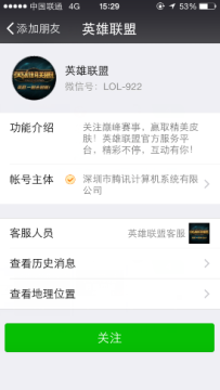 1、首先,在微信通讯录中搜索英雄联盟公众号添加关注,如图: