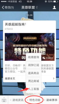 2、在英雄联盟微信首页特色功能中,我们可以看到人工客服选项,点击进入;