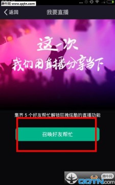 3.首次进行直播的用户。需要集齐5个好友帮忙解锁直播功能,你可以直接点击召唤好友帮忙,然后分享给你的朋友,解锁之后,就可以输入标题,点击摄像按钮,进行直播就OK啦~!