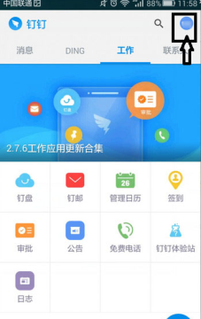 1.打开你的钉钉,在右上角点开你头像的地方进入你的个人中心