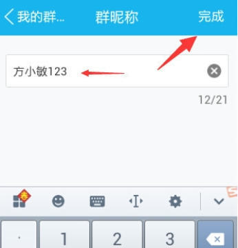 来到群昵称的修改页面,输入自己需要修改的群昵称,然后再点击右上角的“完成”按钮。(如下图)