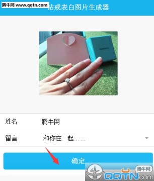 1、首先,我们下载钻戒表白图片生成器后,通过链接输入自己的姓名和留言,留言是选项性的,选择你想要的话,然后点击确定;