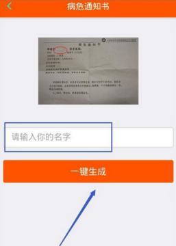 二、然在病危通知书的界面当中,输入你想要输入的名字,接下来点击【一键生成】按钮即可,如下图所示:
