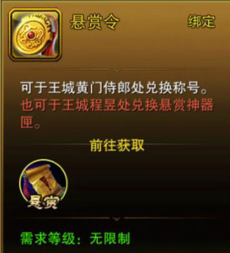 刷完指定数量的怪物之后,或者说等待一定的时间之后,玩家们可以通过任务面板再次进入悬赏界面完成任务,完成之后便可以获得经验值与悬赏令。悬赏令可以在王城黄梦侍郎处兑换称号,也可以在程昱处兑换悬赏神器匣。