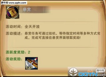 进入悬赏的方式十分简单:在活动列表当中选择悬赏活动即可。悬赏任务属于全天开放的活动之一,玩家们可以通过挂机杀怪或者等待一定时间两种不同方式完成,完成之后便可以直接在悬赏界面当中领取奖励。悬赏每天可以完成十五次,每次头可以获得一定的经验值与两点活跃度的奖励。