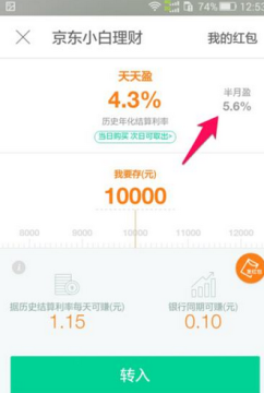 3、此时就可以看看到京东小白理财天天盈、半月盈、历史年化收益了,点击半月盈这个功能进入,如下图。