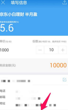 5、在京东小白理财的半月盈购买界面可以选择购买金额以及自己的其它详细信息,没问题就点击购买。