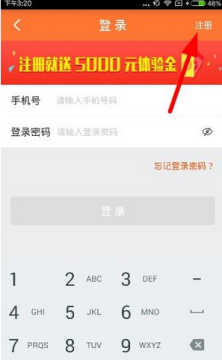 1、新用户进入登录页面后,就可以发现注册就送5000元体验金,然后点击右上角的“注册”按钮,如下图: