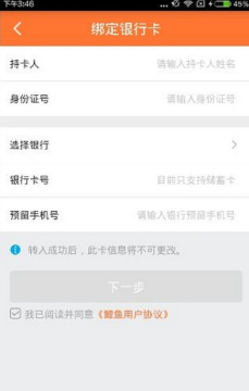 2、用户要提现首先需要完善银行卡的绑定信息,填入持卡人、身份证号、银行、卡号、预留手机好等等。
