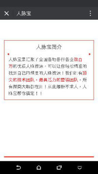 【人脉宝】是高手帮在手机上的高手召集器,能在你事业急需高手时帮上你。万余名会员均为联想、百度等高科技领域内总监级以上高端人士,他们都是真实身份,拥有黄金般宝贵的经验和资源,可以外脑顾问、合作创业的形式开放合作。这里高手云集,有求必应。