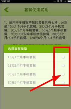 3、在这里选择套餐类型,15元1个月套餐,25元2个月手机套餐,30元3个月手机套餐,50元6个月手机套餐